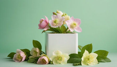 a white square planter containing a arrangement of pink and white hellebore flowers, along with their characteristic green foliage. More hellebore blooms and buds are artfully placed on the light mint green surface around the planter. The background is a solid, soft mint green, creating a cohesive and tranquil color palette. Gentle studio lighting highlights the delicate textures and soft hues of the flowers and leaves.