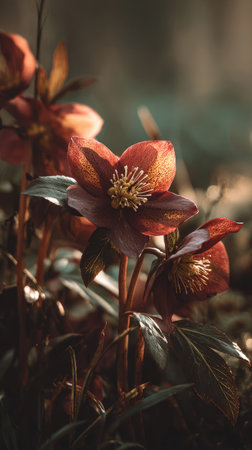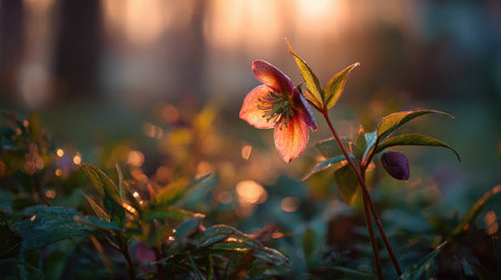 The Hellebore at sunset, Golden red sunset light filters through the leaves, still atmosphere, warm orange glow blending with natural green tones.