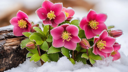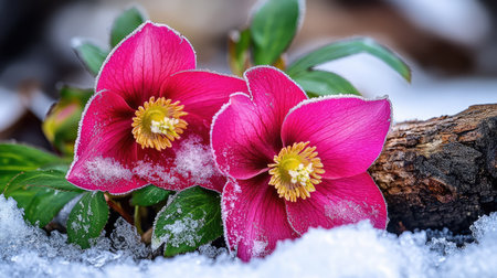 Vibrant hellebore blossoms with frosted edges stand out against snow and bark, a poetic scene of nature contrast