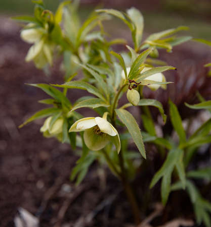 Evergreen perennial hellebore blooms in late winter to early spring.