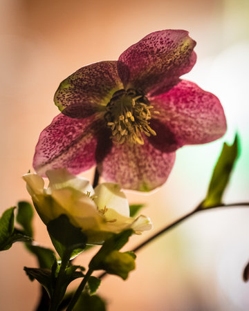 Edge-on macro of this lovely, pink-striped Hellebore called Helleborus x hybridus