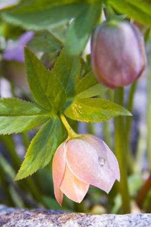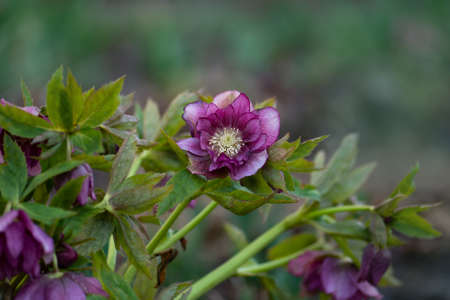 Helleborus purpurascens pink purple early spring flowering plant, beautiful flowers in bloom with green leaves