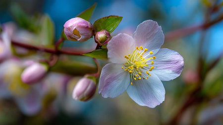 Delicate Pink Blossom and Buds against a Blurred Blue Sky