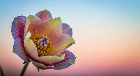 A detailed shot of a flower with dewdrops on its petals, captured in the soft morning sunlight, with vibrant colors and natural textures
