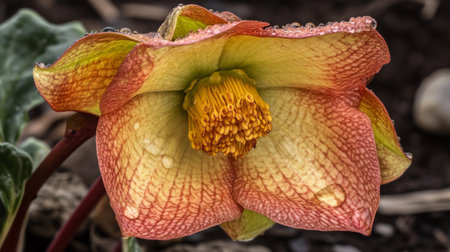Hellebore flower with speckled petals and yellow stamens in bloom.