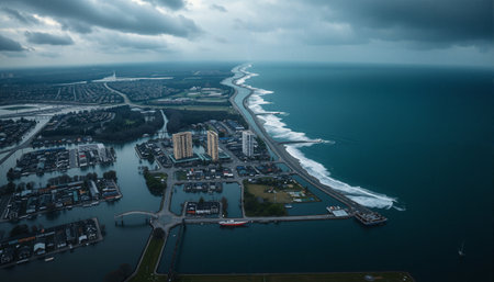 A coastal cityscape is visible from above, featuring a sprawling urban neighborhood with tall buildings and intricate waterways. The water channels merge seamlessly into the ocean, where waves are breaking gently along an extended shoreline. The sky is overcast, casting a muted, cool-tone light over the landscape, making the water appear deep blue. There are several clusters of residential and commercial buildings, surrounded by roads and lush green patches. The citys infrastructure is modern, showcasing dense urban planning intertwined with natural elements. In the distance, the city expands towards the horizon, disappearing into the misty atmosphere.