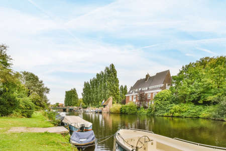 Amsterdam, Netherlands - 10 April, 2021: a canal with houses in the background and trees reflecting in the water on both sides, as well for an article