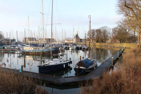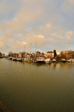 yachts and boats at marine Reitdiephaven before sunset, Groningen, Netherlands