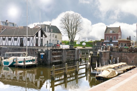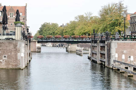 Entrance to the lock of (Dutch) Lemmer (Frisian) De Lemmer (port town on the IJsselmeer, a very big lake), Friesland, Netherlands, restaurants and shops to the left and right