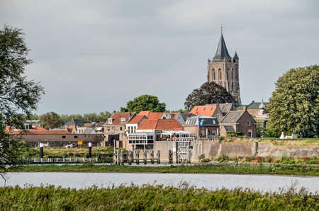 Gorinchem, the Netherlands, September 23, 2020: view across the floodplain of the river Merwede towards the city with its historic wall and church tower