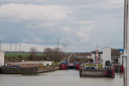 Aerial view of the Princess Beatrix sluice complex in the Netherlands with sustainable energy generating wind mills and solar panels in the background. Waterways transportation infrastructure