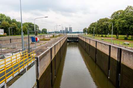 View of a sluice in the river 'the Maas with in the background the power plant of the city of Roermond, province of Limburg, in the Netherlands