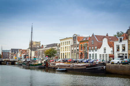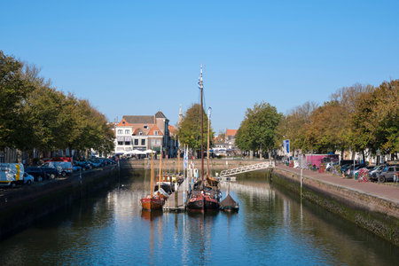 Cityscape Dutch city Zwolle with canal and old sailing ships