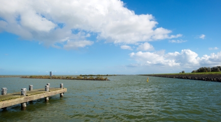 Breakwater with beacon in Oudeschild port at Texel island on sunny october day