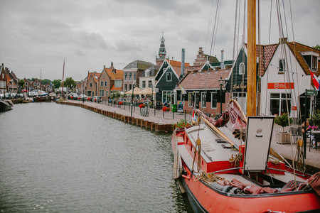 Walking on sunny spring day in small Dutch town Marken with wooden houses located on former island in North Holland, Netherlands