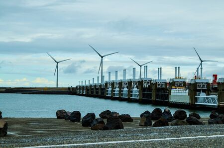 Oosterscheldekering, the Netherlands, August 2019. In Zeeland, wind farms are the setting for the immense dam that governs the flow of sea waters, securing the territory.