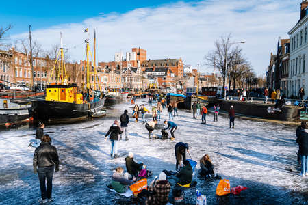 People ice skating on frozen canal in city center in Netherlands. Peoples making pictures, walking and skating on frozen canal in winter. Winter fun in cityGroningen. Netherlands. 14.02.2021.