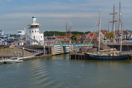Vlissingen, The Netherlands - June 28, 2019: Inner harbor historic Dutch city Vlissingen with two pilot boats ready for departure