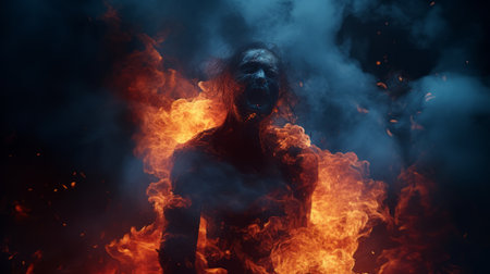 Fiery abstract art of a screaming figure with flames. Concept of fire, anger, expression, emotional release.