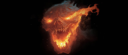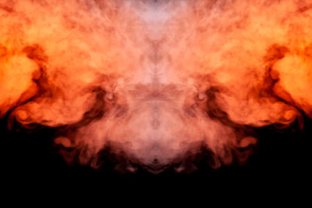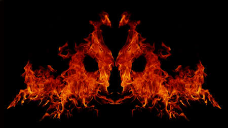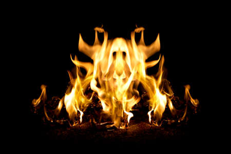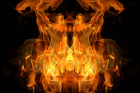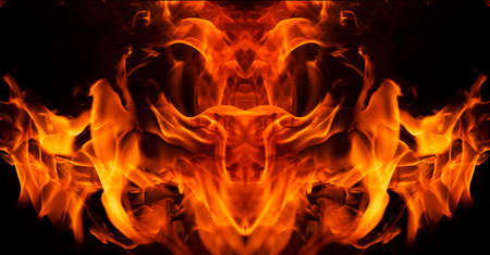 The fiery face created by the tongues of fire resembles the tales of legends and beliefs in the underworld and devils, red crimson orange colors and black smoke soot