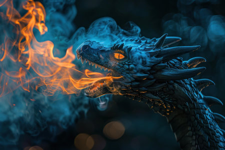 Detailed blue dragon statue breathing out orange flames against a smoky background
