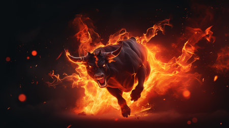 Fiery bull with intense flames on dark background, perfect for stock photography, banner
