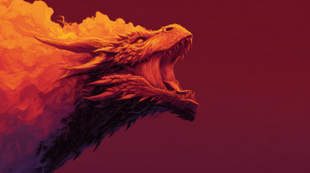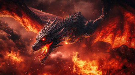 A dramatic illustration of a fierce dragon rising from fiery clouds, symbolizing power and imagination. The vibrant colors and intricate details create an epic fantasy scene.