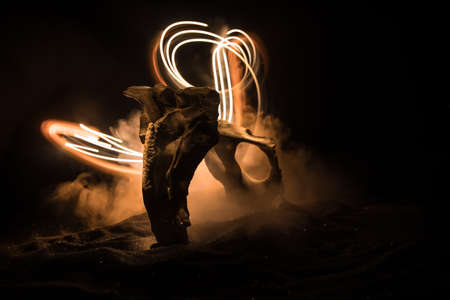 Abstract surreal concept. Giant animal bone in dark. Night with fog and light on background. Selective focus