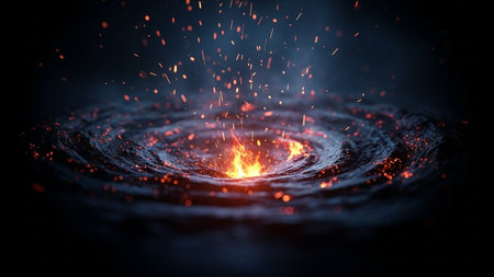 A dark, rippling surface with a fiery core emitting glowing orange sparks upwards in a dramatic, intense display.