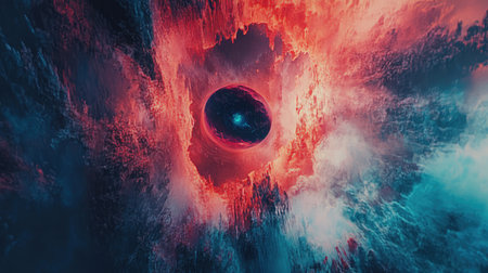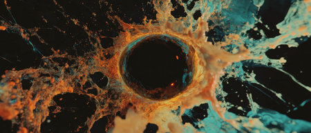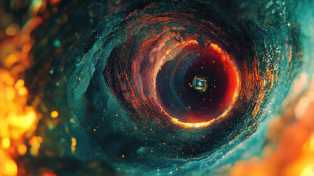 This abstract image features a dark hole surrounded by colorful topography. The composition utilizes a wide angle, showcasing a variety of hues, gradients, and textures. The overall aesthetic is evocative, suitable for artistic, design, or conceptual projects. The image can be used for a wide variety of commercial or editorial purposes.