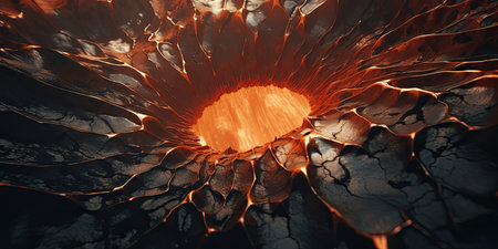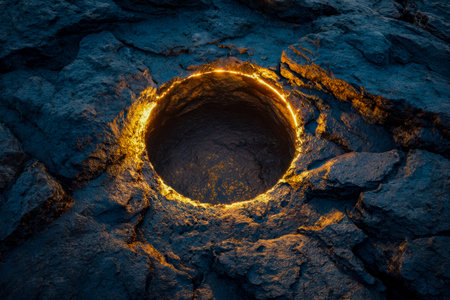 An illuminated orange circle appears in a cracked, dark environment. The scene showcases a moody, abstract composition with textures and dramatic lighting. This image could be used for various creative projects, including science fiction concepts, digital art, or conceptual illustrations.