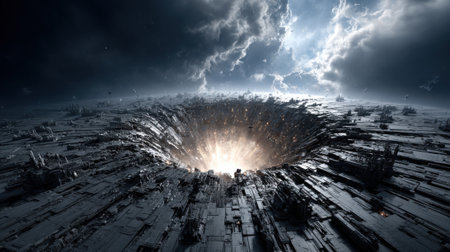 An illustration of a thick concrete wall with a massive, jagged hole in the center, cracks radiating outward like a spiderweb, the interior of the hole a deep, shadowy void realistic portrait. 4k image, Canon EOS R5. --ar 3:2 --style raw --sref 1113391764 --stylize 400 --v 6.1 Job ID: 5fa1923b-8b7c-4392-958c-407a9156221b