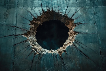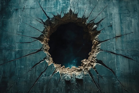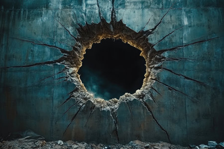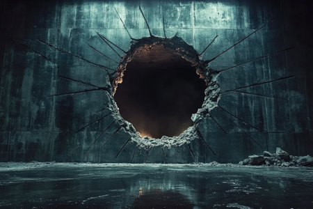 An illustration of a thick concrete wall with a massive, jagged hole in the center, cracks radiating outward like a spiderweb, the interior of the hole a deep, shadowy void realistic portrait. 4k image, Canon EOS R5. --ar 3:2 --style raw --sref 1113391764 --stylize 400 --v 6.1 Job ID: cde1ca41-c083-4314-913c-b087238f9841