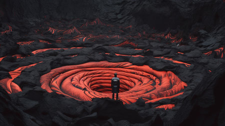 Man in the middle of the lava flow. 3d illustration.