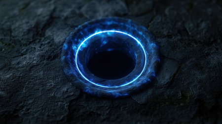 Glowing blue portal in dark rocky environment