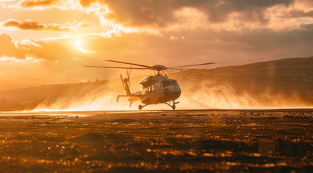Helicopter lifts off during sunset, creating a dramatic scene with dust and light, emphasizing military aviation technology and operational capabilities in action