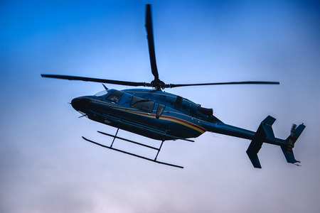 A flying black helicopter aircraft during the flight with blue sky in the background