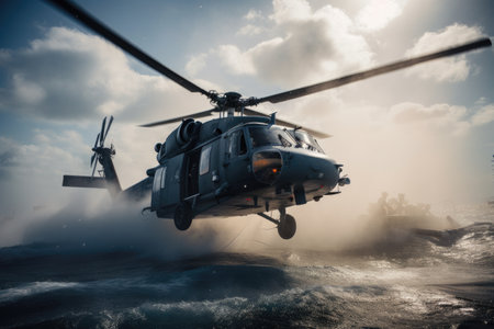 Helicopter landing in a stormy sea. Military background. Navy helicopter flying in a warzone, AI Generated