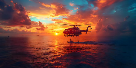 A captivating helicopter in flight at dusk, captured against a stunning sunset sky, showcasing the interplay of light and clouds in a serene atmosphere of aviation beauty.