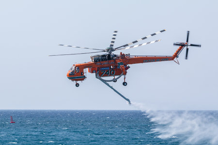 Paros Island, Greece- 26 September 2020: A helicopter of the fire brigade extinguishing a fire off the coast of the Paros island. Sikorsky s-64e skycrane.