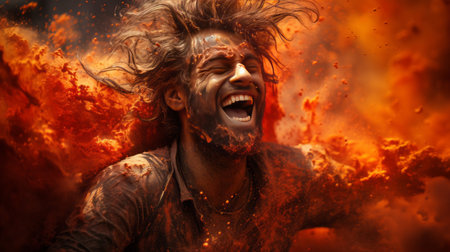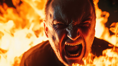 Screaming man engulfed in flames. Male face shouting in agony surrounded by fire. Suffering person