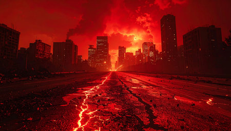 A once-thriving metropolis is now a vision of hell on Earth. Rivers of molten lava carve through the cracked streets, illuminating the skeletal remains of skyscrapers against a blood-red sky.