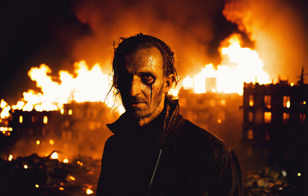 Creepy zombie on the background of a burning city. Terrible zombie monster