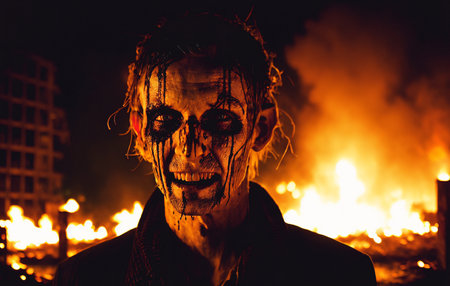 Dramatic close-up of a screaming face surrounded by fiery smoke, symbolizing fear, panic, and chaos.