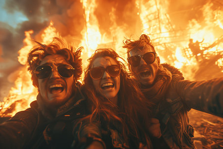 Portrait of a group of people on the background of a fire