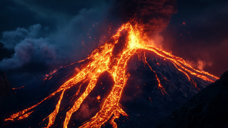 Dramatic volcanic eruption with flowing lava and explosive ash clouds. Concept of natural disaster, geology, environmental impact.