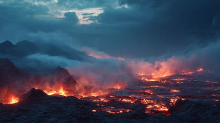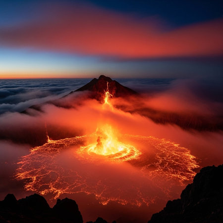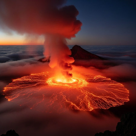 captivating scene of an active volcanic eruption, showcasing molten lava, smoke plumes, and fiery glow beneath a dramatic evening sky, exuding intense energy and natural grandeur.