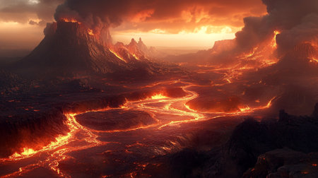 Majestic volcanic eruption at sunset with streams of flowing lava and billowing smoke. Concept of natural disaster, earth's geology, beautiful but dangerous landscapes, and volcanic activity.