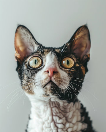 Close-up of a surprised Devon Rex cat with wide eyes.