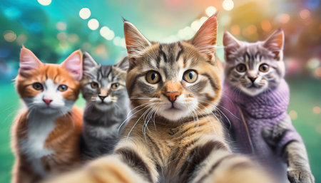 Group of cats in front of bokeh background, close up